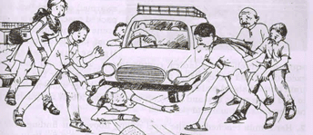 33. The picture is an accident scene. A school going girl is hit by a car. She has fallen on the road. The books are spread on the road. She is wounded. People are rushing to help her. We should be cautious while crossing road. We should lend helping hand to the needy.