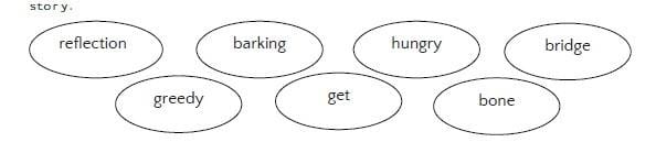 There was a dog that was very _______________. He searched for food everywhere and at last he found a bone. He picked the _______________ with his mouth and started going back home. There was a _______________ on the way to his home. When he started crossing it, he saw his _______________ in the water. The dog thought that there was another dog with a bone in water. He wanted to _______________ that other bone too. He started _______________ at his own reflection. The bone in his mouth fell in water as soon as he opened his mouth. The _______________ dog lost his bone.