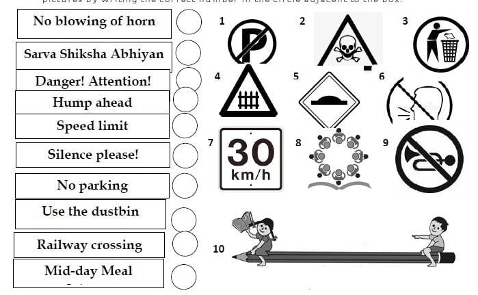 1) The meanings of a few signs or logos are given in the boxes. Match them with the pictures by writing the correct number in the circle adjacent to the box.